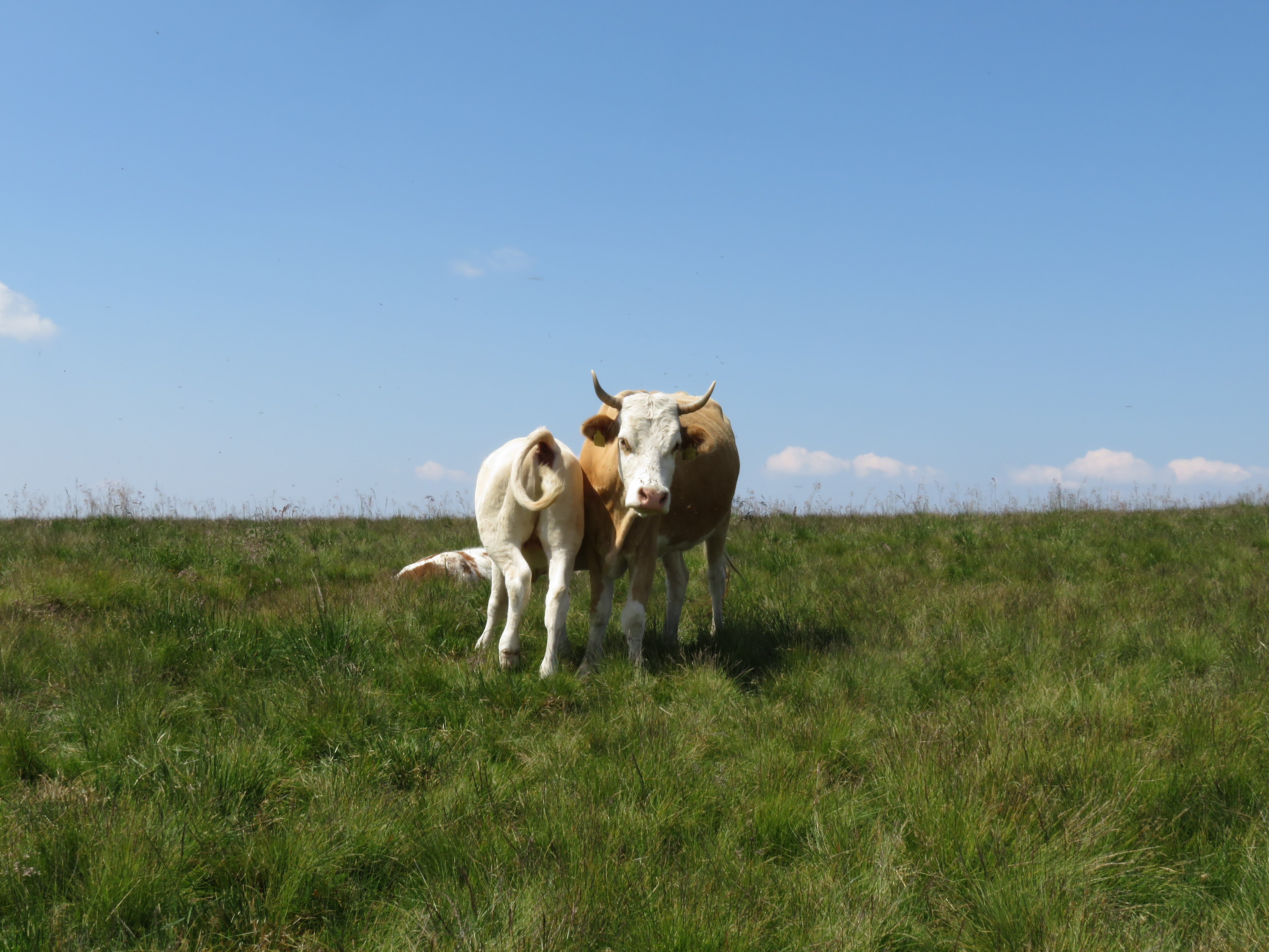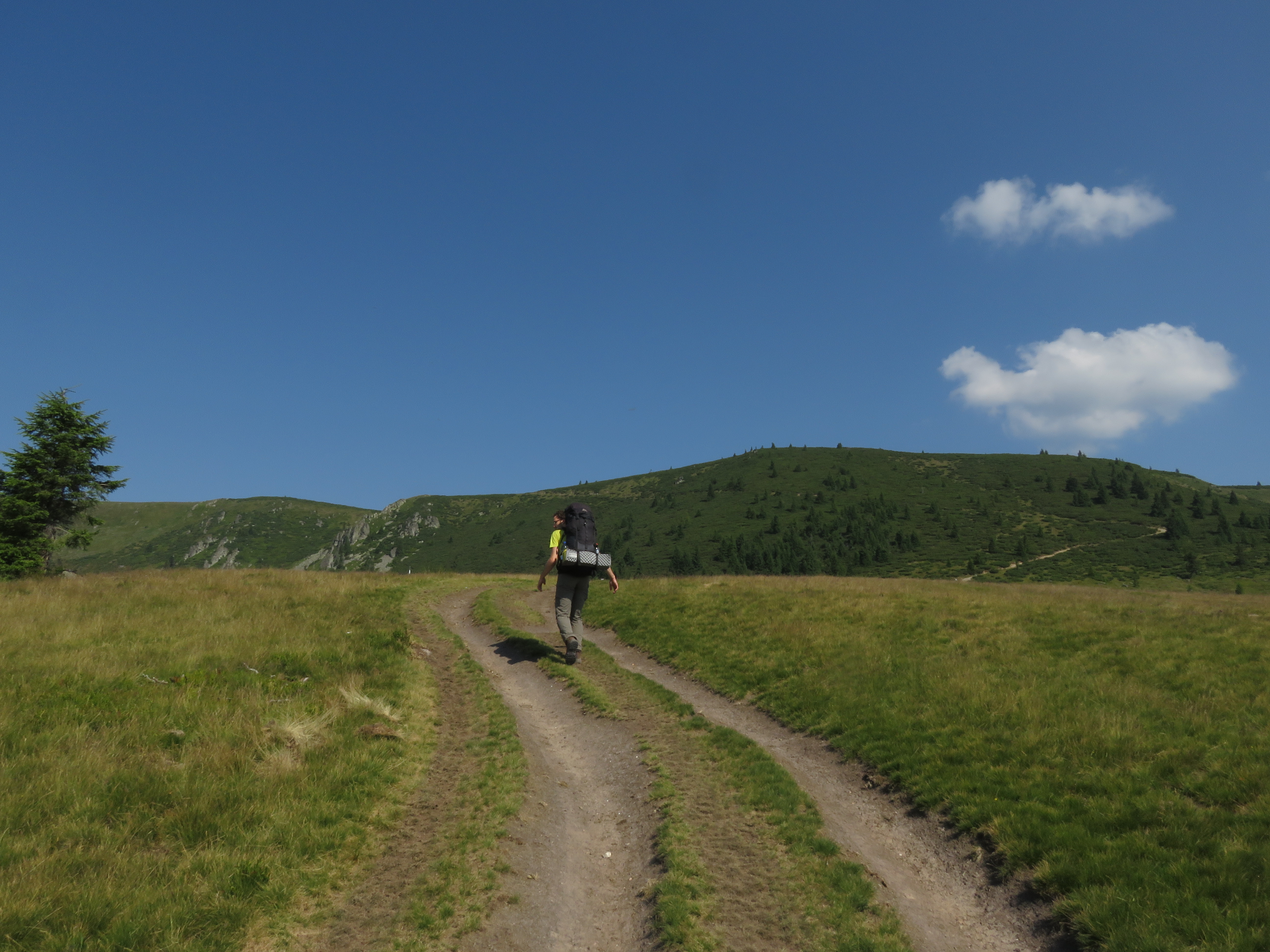 Right, so, let’s get going. From the signpost in the centre of the village turn right (north) onto the 750 road. It is marked blue stripe, blue circle and red cross. After about 500m, turn left (Pensiunea Marinarul is on this road; it’s the first house on the right); then immediately right (east) onto a narrow trail, up into the woods, marked red cross. When you get to a meadow after 1.3km, cross it to the southeast initially, then northeast. When you get to the road, turn right onto it. After almost 5km, you will see Pensiunea Scărişoara on the right. It’s possible to pitch your tent here and they serve great meals (large portions too). It is a traditional Moţi farmhouse (the Moţi are the indigenous people of the Apuseni region).