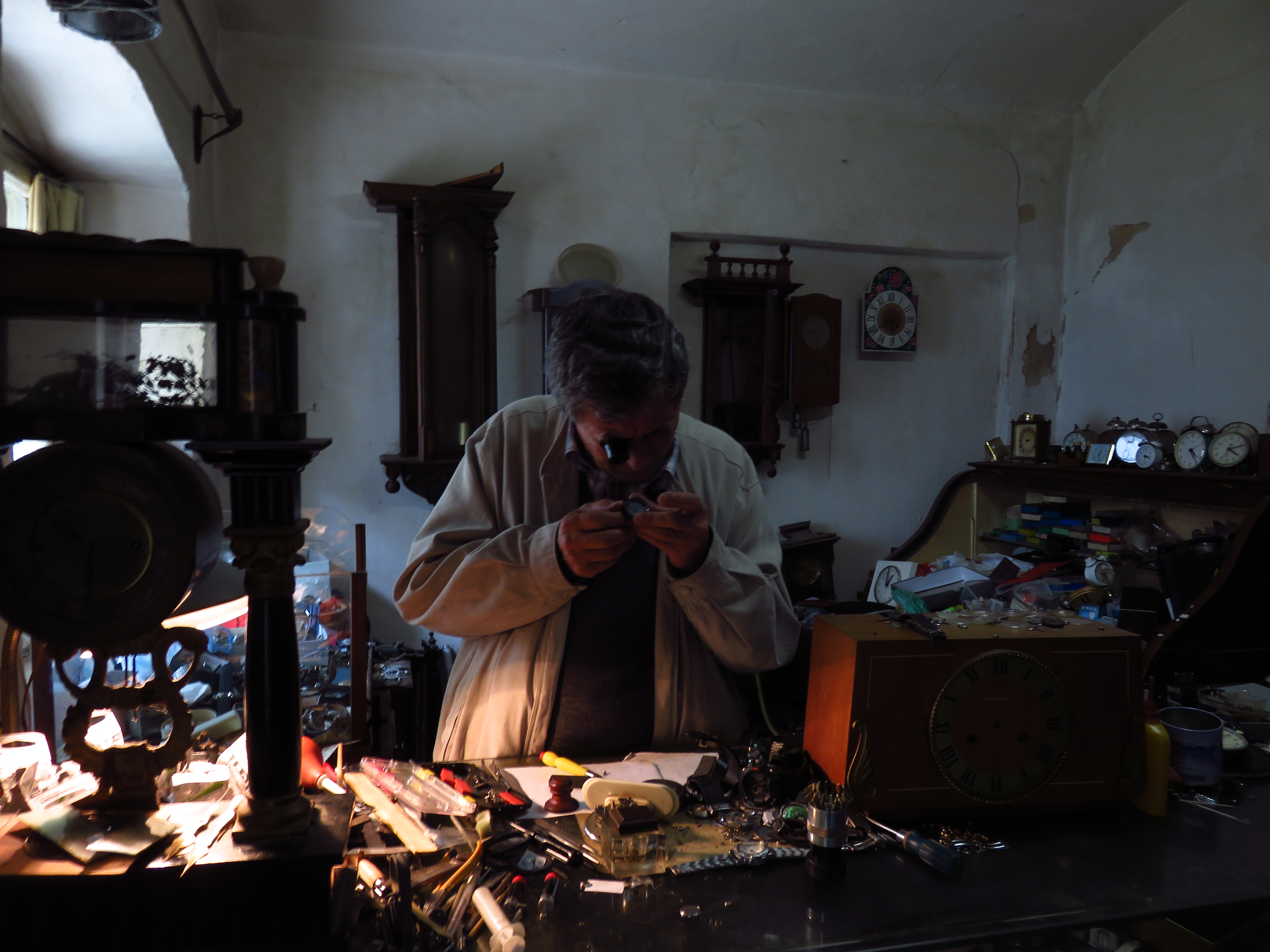 So, on what I think was the next day, I had to find a place to replace the battery of my Suunto heartrate belt, which I couldn’t possibly do myself because they put these impossible screws in it – to keep it waterproof, I suppose. Mihai from the ProAlpin outdoor shop pointed me to a watchmaker in an alley off Bălcescu street – this one turned out to be away on concediul – holidays. So I climbed the steps to Bijuteria Flandra – partly because I was intrigued by the name, partly because I thought maybe they could help. They couldn’t, but sold beautiful old jewellery (another reason to come back – when I’m rich), but the lady behind the counter more ore less ordered an old man to accompany me to Mr Corneliu, which he gladly did. As we slowly walked down the stairs and into the street again, he proudly proclaimed he was seventy-two. I told him it was respectabil for which he thanked me. Mr Corneliu turned out to be located in an alley just across the street. Hidden behind a bright green door, I found an impossibly small workplace, with three elderly people queueing. As I tried to squeeze myself in, my ass bumped into some things – presumably ancient clocks – behind a curtain. Something fell. No-one commented. The workplace was remarkably dark for a watchmaker’s, but there was a small bright light on the desk. Mr Corneliu swiftly helped the three customers ahead of me, and then started examining my Suunto sensor. For this, he used a special looking glass that he squeezed in front of his eye. (My husband says this is quite ordinary, but I thought it was intriguing.) I started to not so secretly take pictures of the man. A young couple entered. Mr Corneliu asked me what the little device was for; I explained and he told me to test it to see if he’d done his job right. I asked what I could pay him. Upon which he asked me whether I was a student or worked in Sibiu; I told him no but that I was writing a mountain guide about Romania. This greatly pleased him and he said I didn’t have to pay. He was very happy I was writing about his country – it has plenty of beautiful sides, he said, but, you know… In fact, I can’t remember exactly what he said, but the gist of it was that he and the young couple agreed with me that Romania needed an outsider’s eye to put it on the (touristic) map.