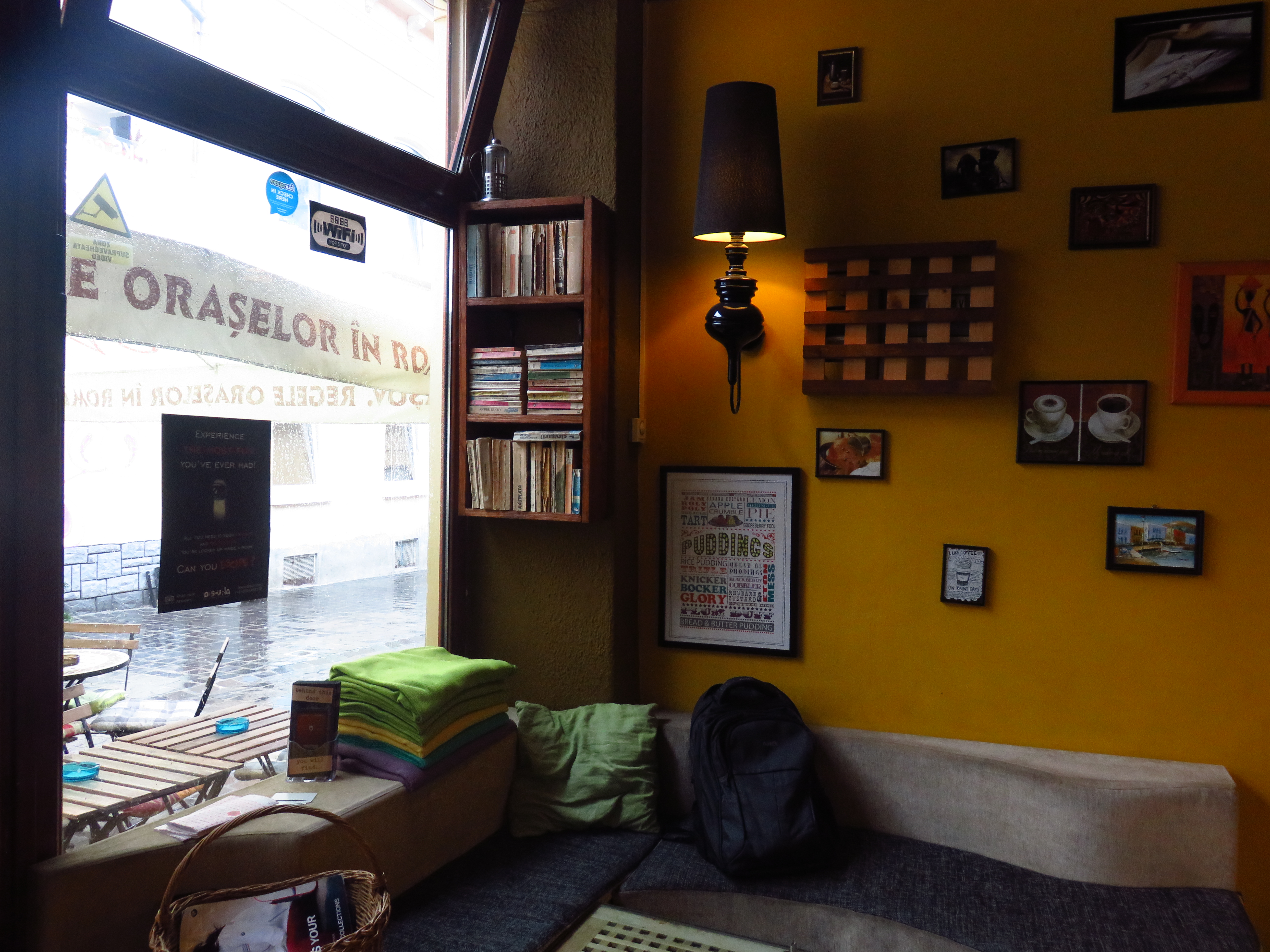 Although Braşov’s old centre isn’t exactly big, it boasts numerous bookshops. Seriously nice ones, too, that actually sell English books. There is Cărtureşti on Strada Mureşenilor; St Iosif (great selection of music!) and Okian further down the same street; and Humanitas on Piaţa Sfatului. They all have cosy corners where you can sneakily read your book before you buy it. More good places to hide against the rain…