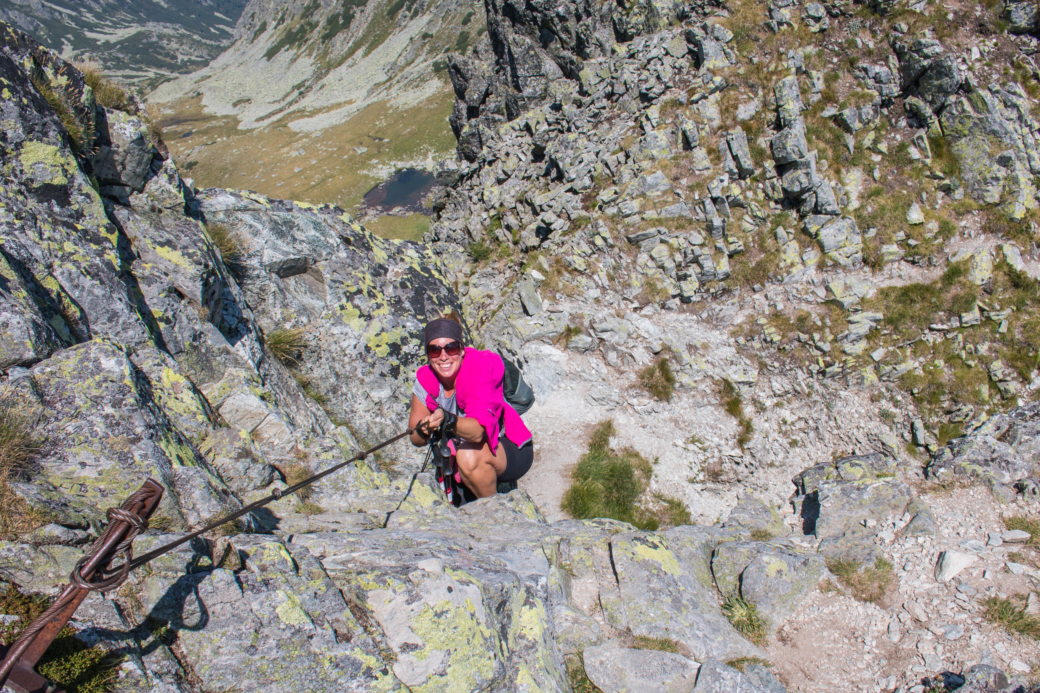 After 3.3km, there is a steep section down with some cables, but it’s short. You’ll soon see Tău Ţapului on your right, which is another interesting lake because it has a little skull-shaped island in it, with tree clumps for the eyes. After this, there is a plateau section; but soon, you’ll find yourself scrambling towards Mare Peak over a ridge called Porţile Închise, ‘closed doors’. Worry not; it is not as closed as it sounds. Just a fun scrambling section. Just before Mare Peak, descend west towards Galeş Lake via the red triangle trail (it’s pretty steep). If you need to refill your bottles, you can do so here – there is a stream flowing into the lake from the south. To start making your way back to Bucura Lake, make a sharp left turn onto the red stripe trail to Zănoagelor Saddle, from where you will have stunning views in all directions – you’re essentially surrounded by lakes here. From the saddle, descend into the valley and climb back up to Pelegii Saddle.