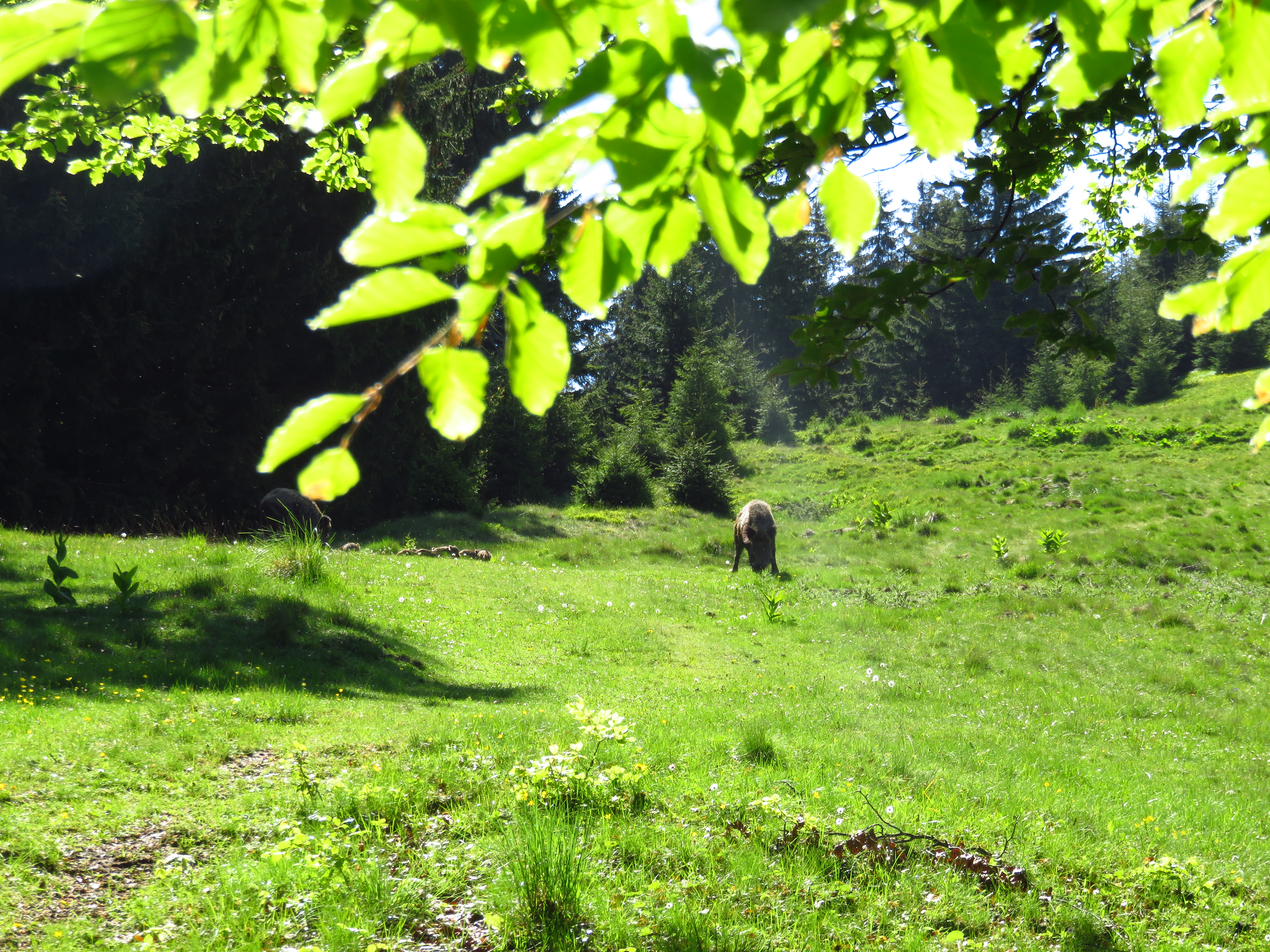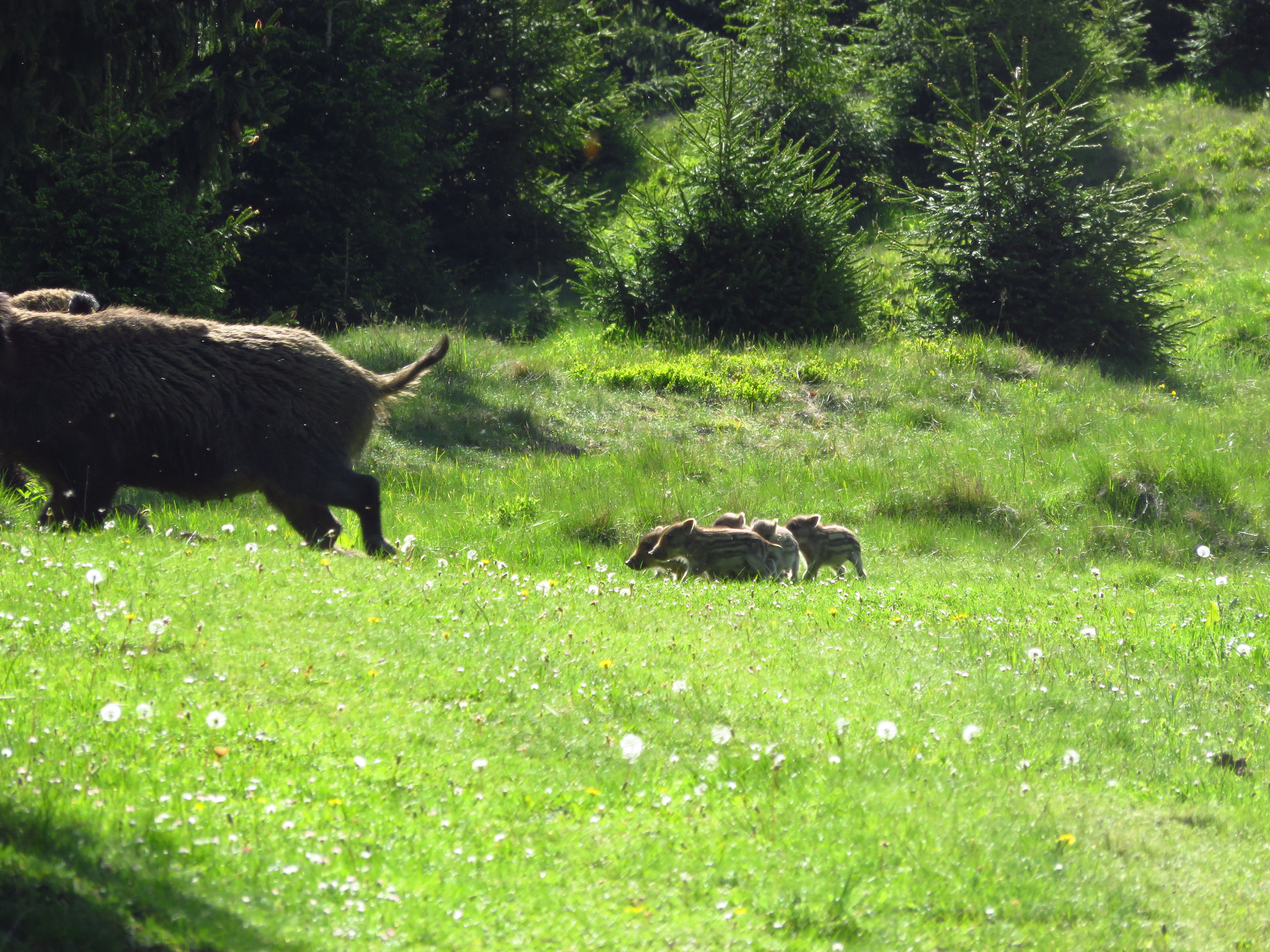 After about 3km on the trail, I get a wonderful surprise: a meadow opens up in front of me and I see some hairy creatures. At first I think it’s sheep – then I notice the piglets. It’s a family of wild boar, foraging for whatever it is they eat. As soon as they notice me, mummy and daddy make a dash for the nearby forest under loud grunts – the five little ones follow suit. When I arrive at the spot where they entered the forest, they are nowhere to be seen. It makes me realize how easy it is for animals to hide and how many there are probably around me a lot of the time without me noticing.