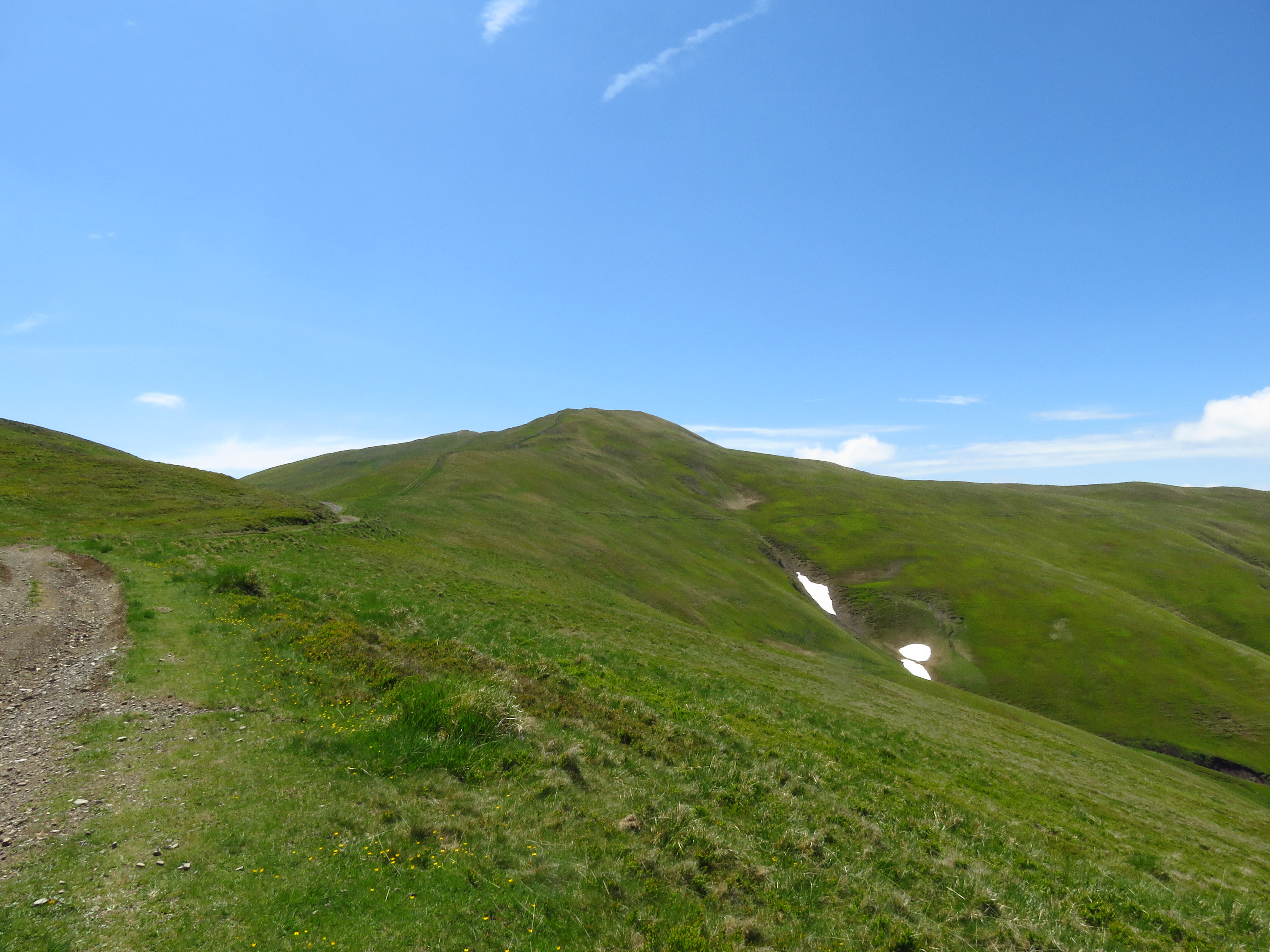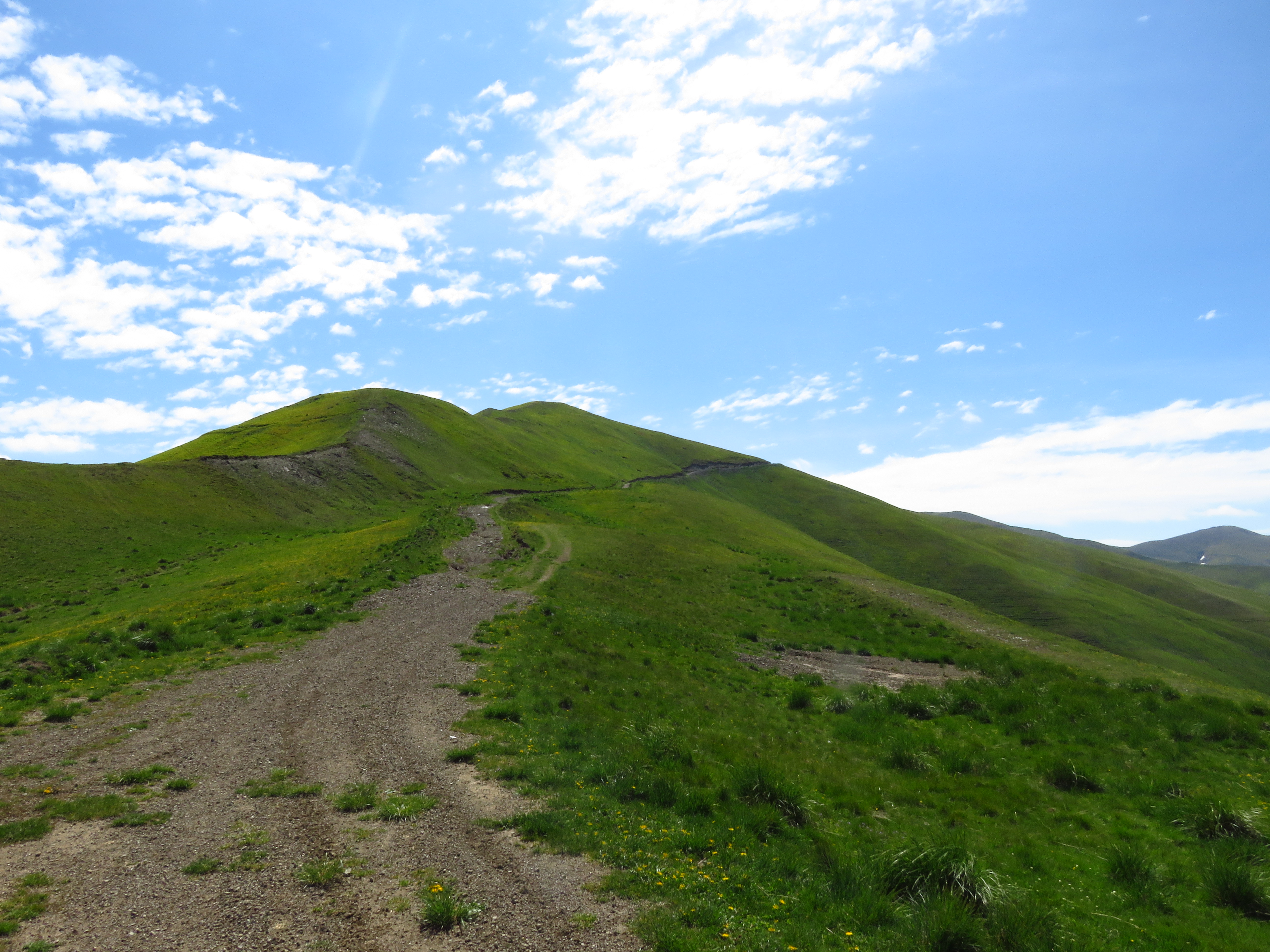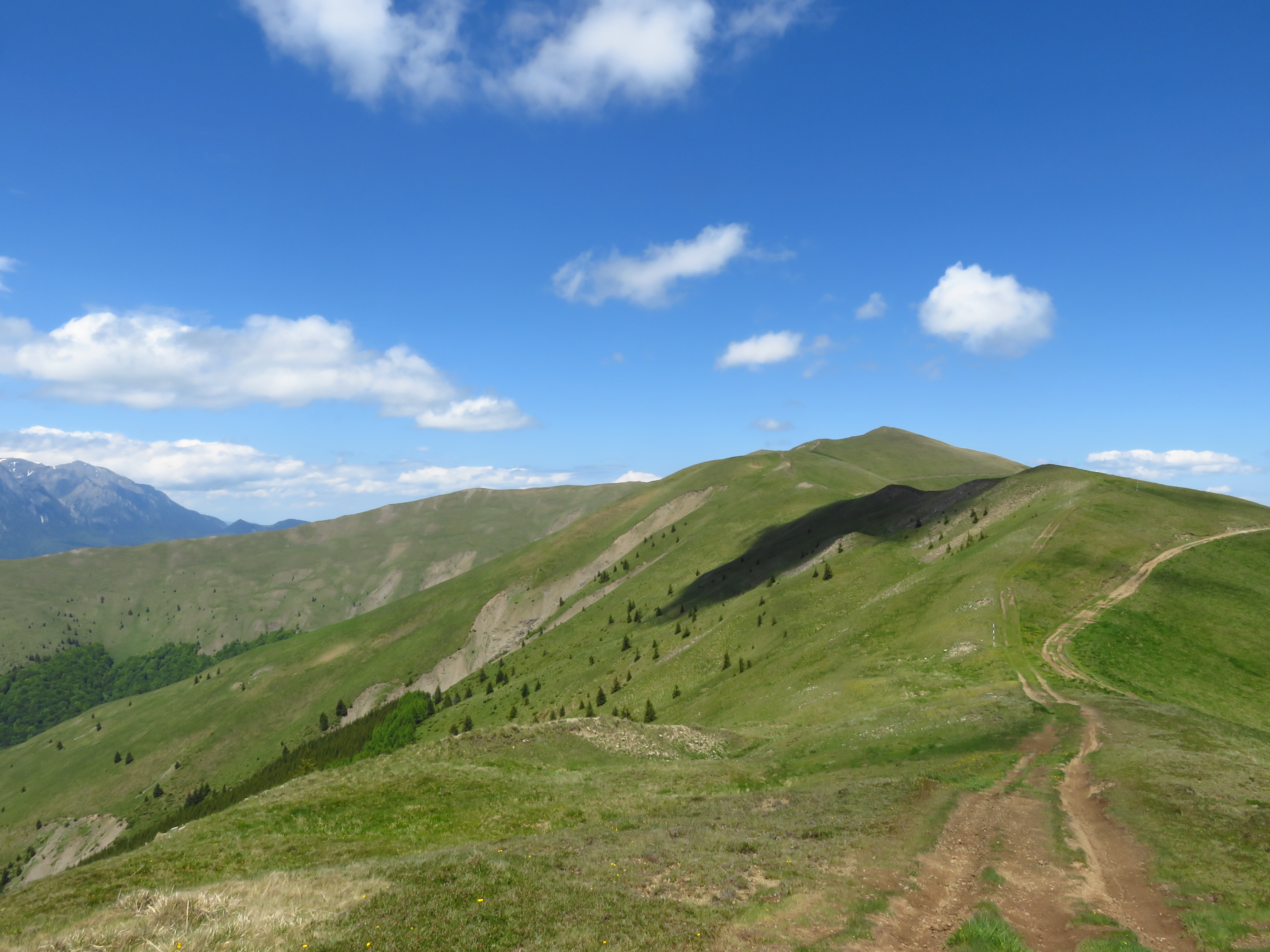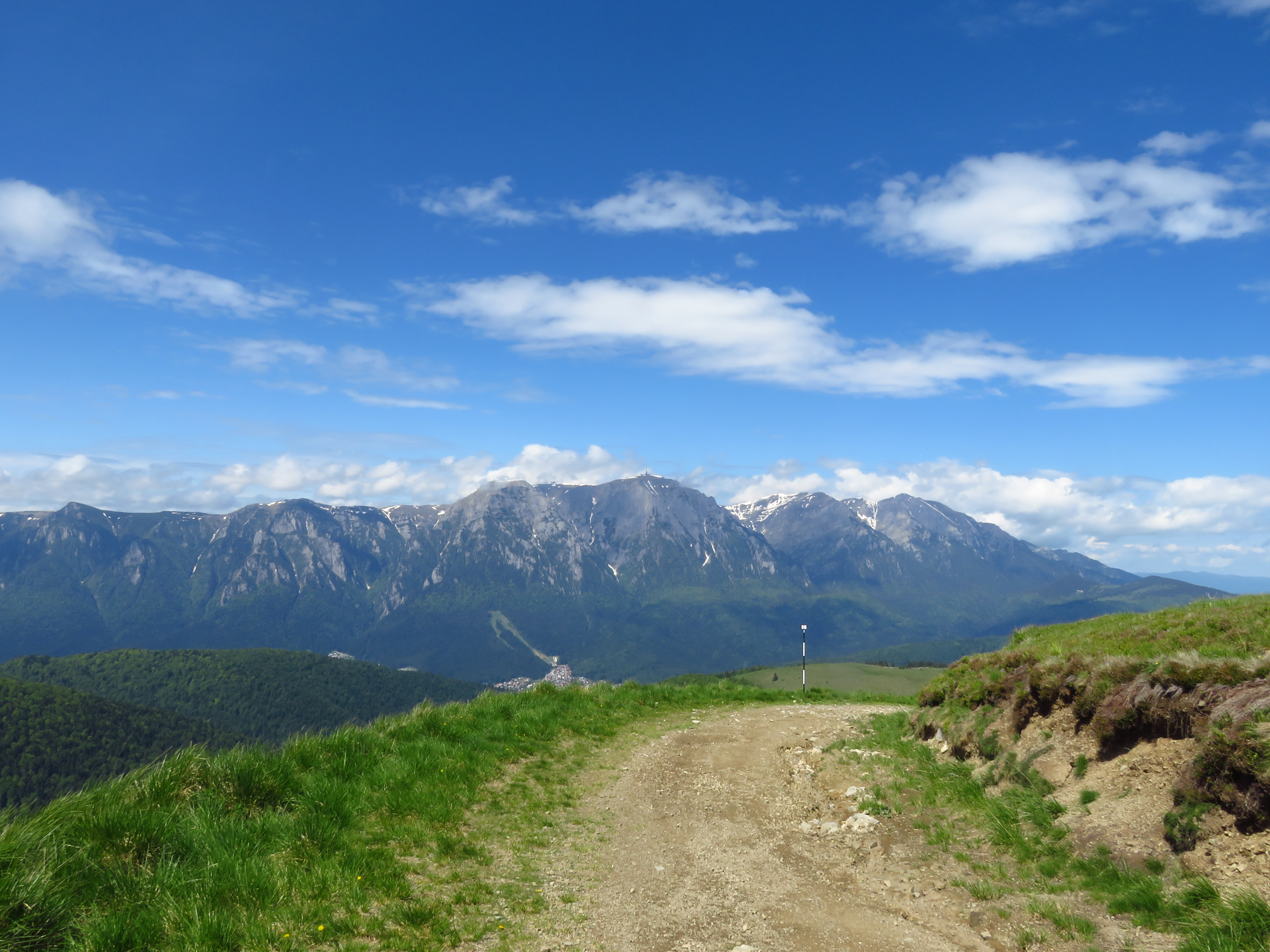 Invigorated, I soon arrive at the chairlift station, eat an apple and start heading south over the ridge, with beautiful views of the Bucegi to my right. Things are going really well; my average speed keeps going up – I walk long stretches at 5.5 km/h. The trail is supposed to be about 26km and so far it has been well marked, so when I stop for lunch after 14km, I expect I will need under four hours to complete it. After a while, I realize that if I keep going this fast I can even make the 16:40 train; that seems a fine goal so I keep taking large strides. The trail is now a gravel road so the going is easy.