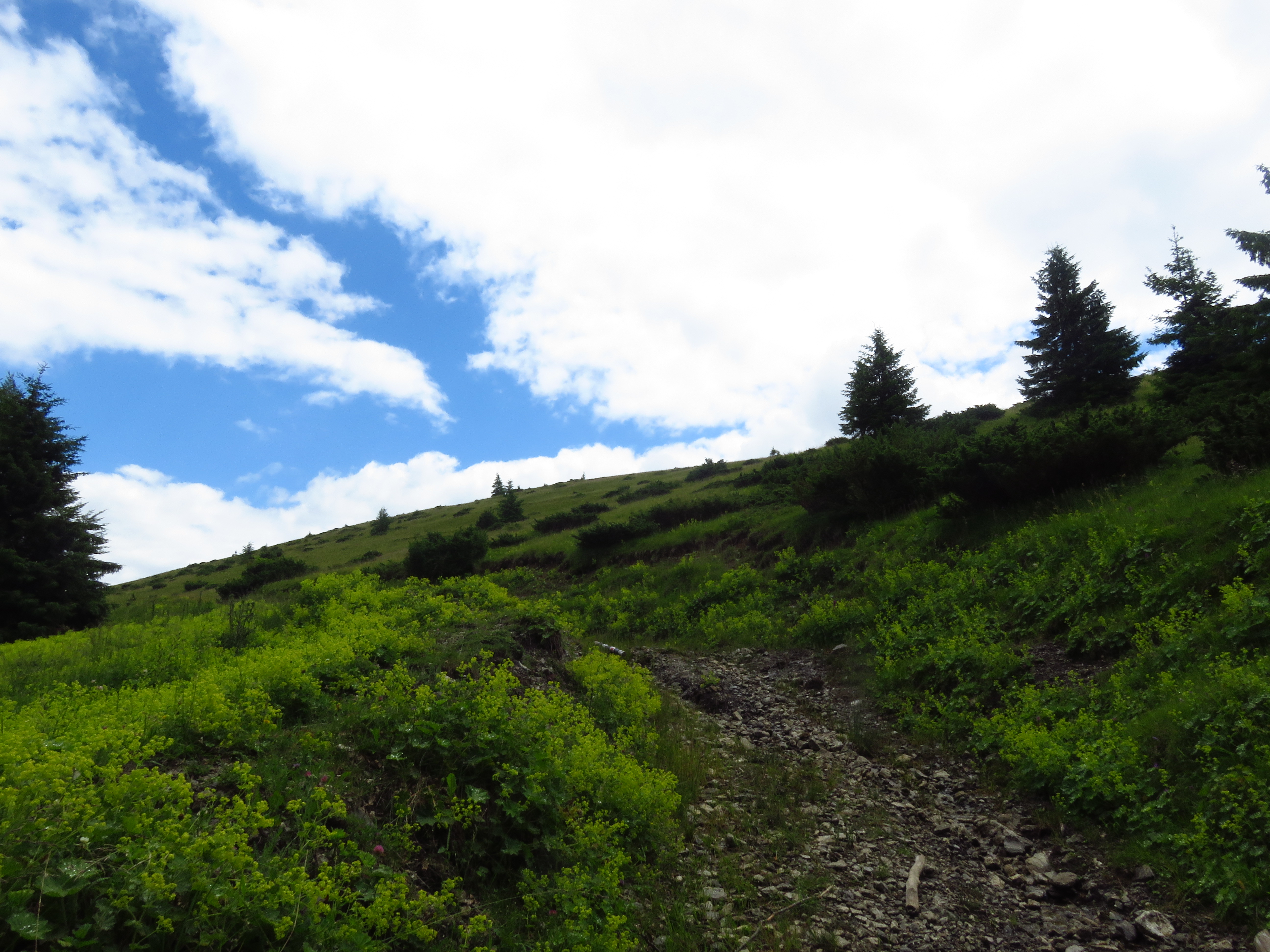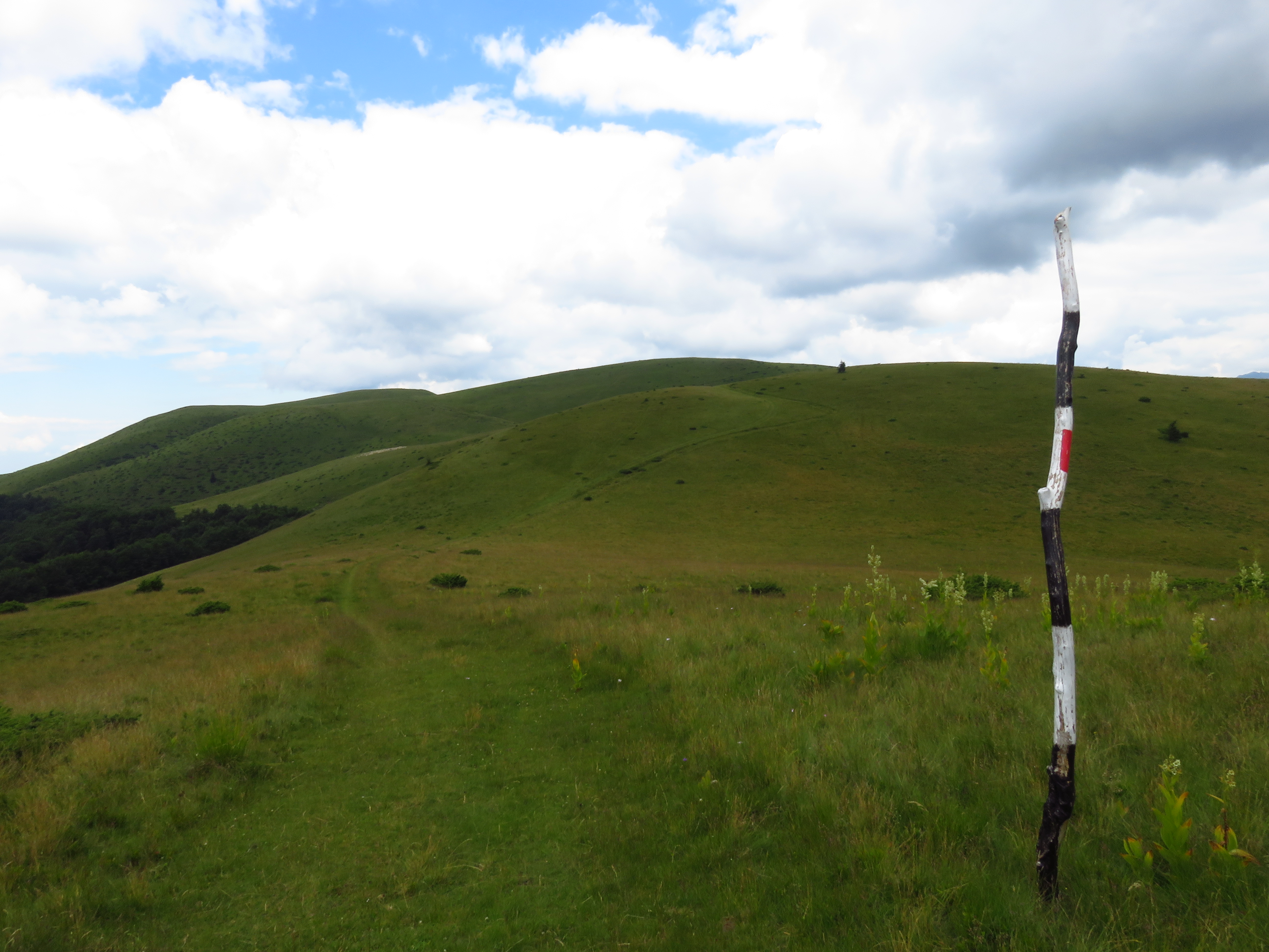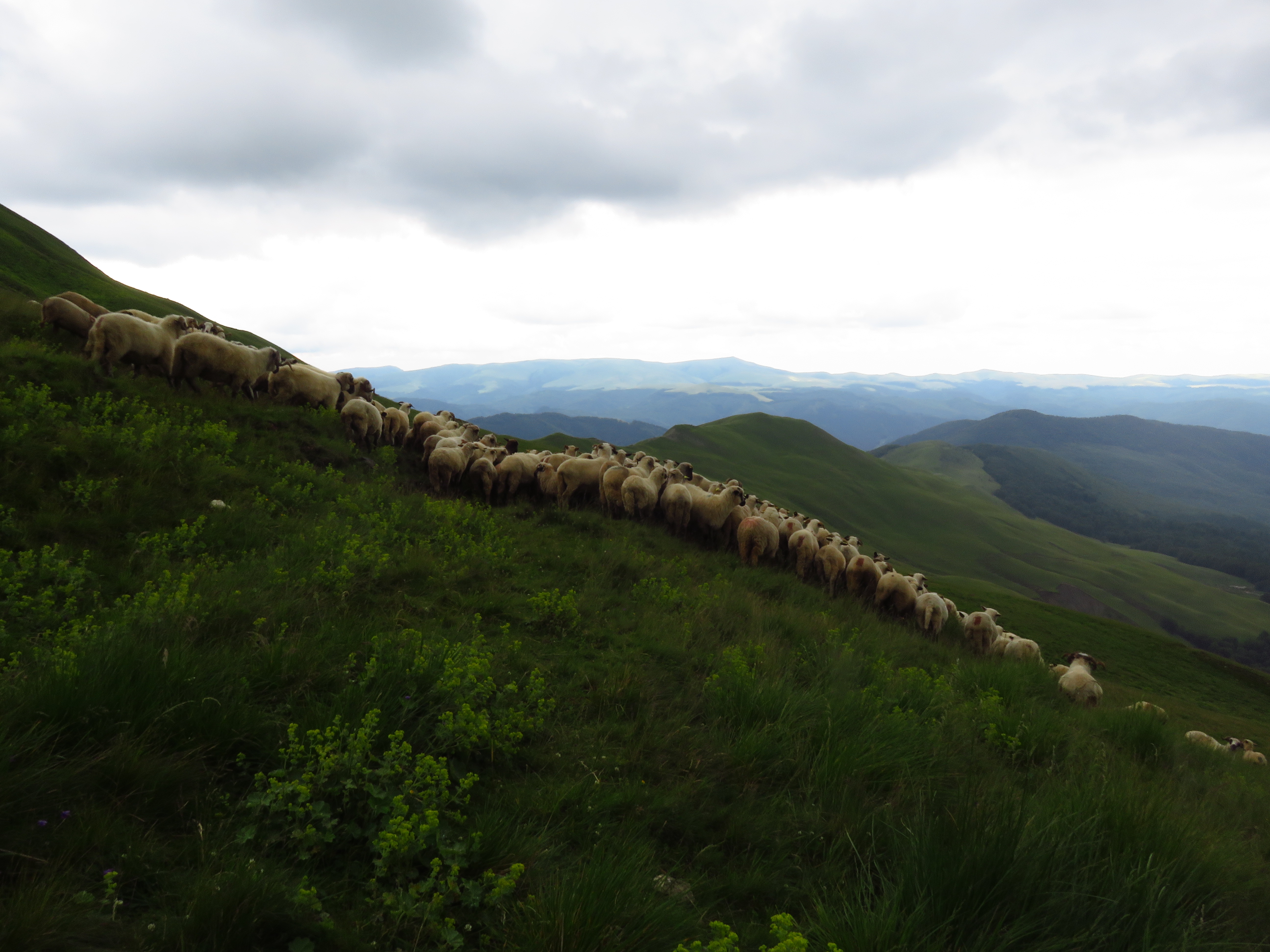I was now in the Grohotiș Mountains. This is a little visited area, but nevertheless, the trail had recently been re-marked: it was easy to follow because of sturdy upright branches painted black and white, with red stripes at the top of course. There may be few hikers in the Grohotiș, but that doesn’t mean I didn’t meet anyone: I saw at least twenty flocks of sheep and talked to at least six shepherds. The first one I met, after about 4.5km on the trail, was very friendly, but his dogs weren’t – two of the big black monsters came hurtling towards me and it was very hard to stay focused on the trail and keep the dogs away from me. I had one walking pole behind me, one in front, and tried to focus on my steps without losing sight of the dogs, one of which looked particularly threatening – and then I fell. They could have bitten me there and then had they wanted to. Fortunately, nothing happened. Soon afterwards I met the shepherd, who interrogated me about my motives: Why was I doing this alone? Was I aware of the fact there were many bears in the area? What would I do when I met one? I had to admit I had no good answer to that question; that I knew I was taking risks but that I felt bored to death by life in a city. That was something he understood very well. I really appreciated this man – he gave me none of the ‘You’re a woman alone on the trail and that’s dangerous’ bullshit, but addressed real issues and just questioned me sincerely. He walked with me for a few hundred metres and then gave me a firm handshake.