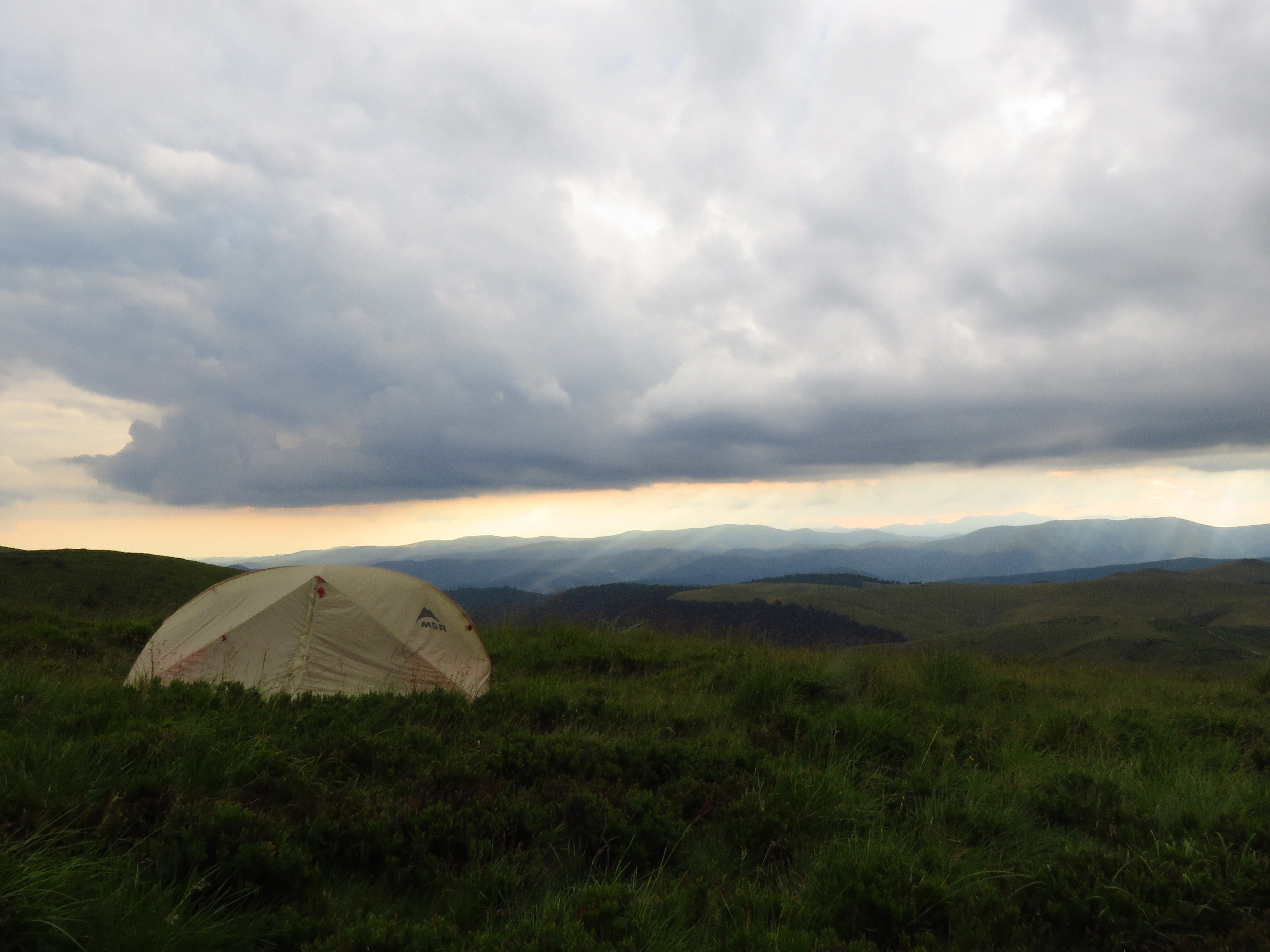 Around 5pm, I arrived in a valley that looked like a good area for camping. However, I could see a flock up the flank of a mountain to the left and a corral to the right. I definitely didn’t want to be in the way of that flock coming home while pitching my tent. Upon closer inspection, I also saw what looked like an army truck – and it was. When I arrived at the potential camping spot I encountered three soldiers who also interrogated me and thought what I was doing was very dangerous. I told them I was mainly scared of the dogs, but cheerfully added that if they thought it was OK to camp there maybe I could too. Then one of them timidly told me I wasn’t allowed to stay there, nor could I take pictures of their activities. Now I didn’t particularly want to camp right next to them, so I left them and clambered up the slope, where I found a peaceful spot and pitched my tent just before the rain. Funnily enough, the flock ended up passing right by my tent and not past the soldiers’ camp – there was another stâna close by which I hadn’t seen from below. By that time I was safely inside though; the dogs inspected my tent for a while but soon left me alone. I felt really pleased at the day’s achievements and enjoyed my meal a lot more than the previous night – and slept really well on top of that.