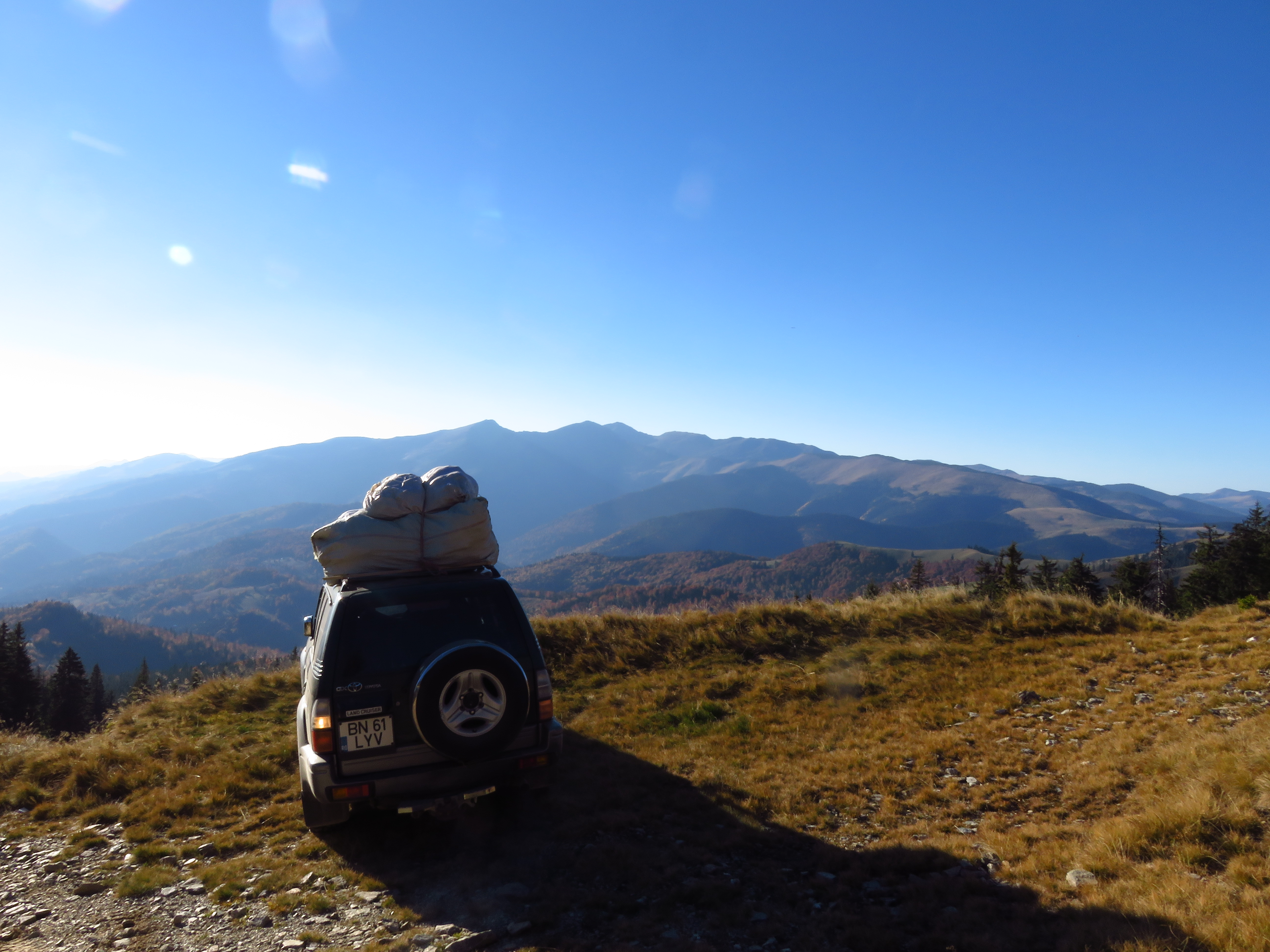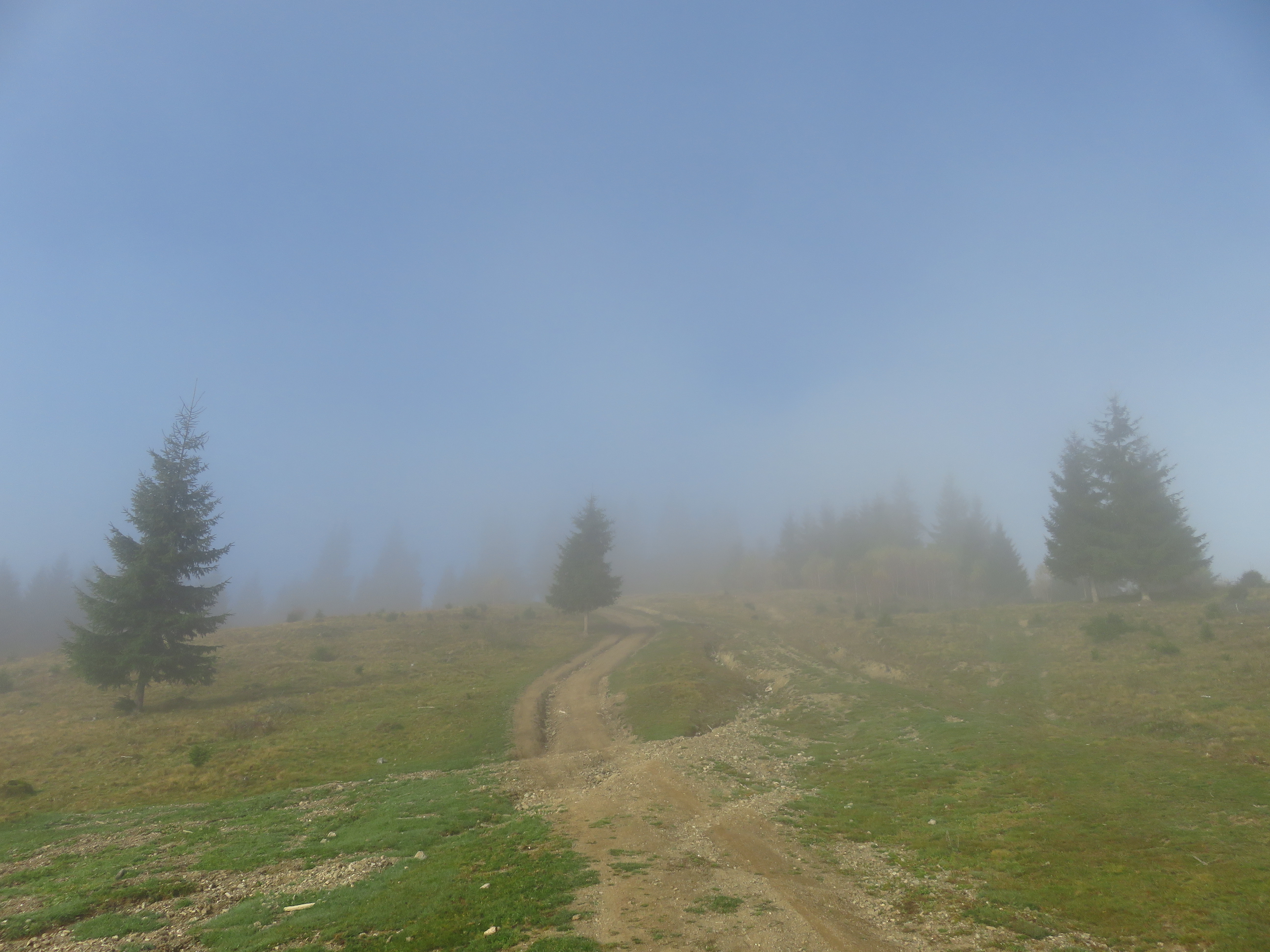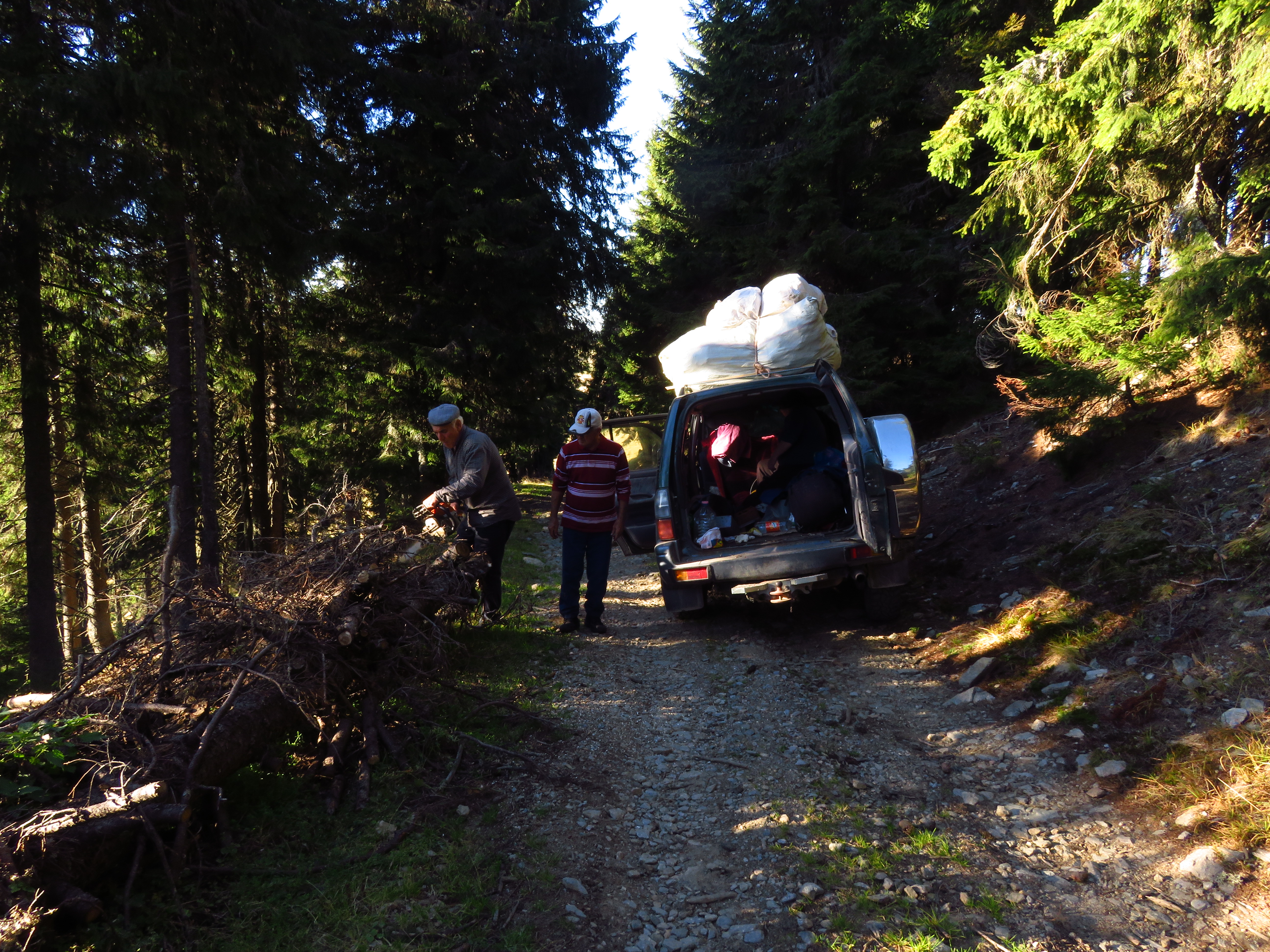 The next morning I continued on the blue stripe trail to Omu Peak (1932m). This was one of only two peaks that were actually on the trail; the other one was Pietrele Rosii Peak (1772m). Actually no – Omu Peak was preceded by a much peakier, but unnamed peak that had me swearing because I didn’t expect to have to clamber (and I didn’t feel like it). At Omu Peak navigation got a little more difficult; there was an ancient rusty signpost that didn’t give out all too many clues. I descended west on what I thought must be the red circle trail – but there were no red circles to be seen. Nevertheless, I seemed to be heading in the right direction. I soon saw a car and two men picking herbs. One of them turned out to be the owner of Cabana Croitor, one of the cabanas at the pass I was heading towards. I didn’t even know it existed, but happily accepted his invitation to come and stay. I continued walking and saw a lady gathering cranberries; she said they would leave soon and I could hop on if I wanted to. A few kilometres down the trail they did indeed overtake me and I joined them. It was 5pm and I had about 8km ahead of me, so I was quite happy to move a bit faster.