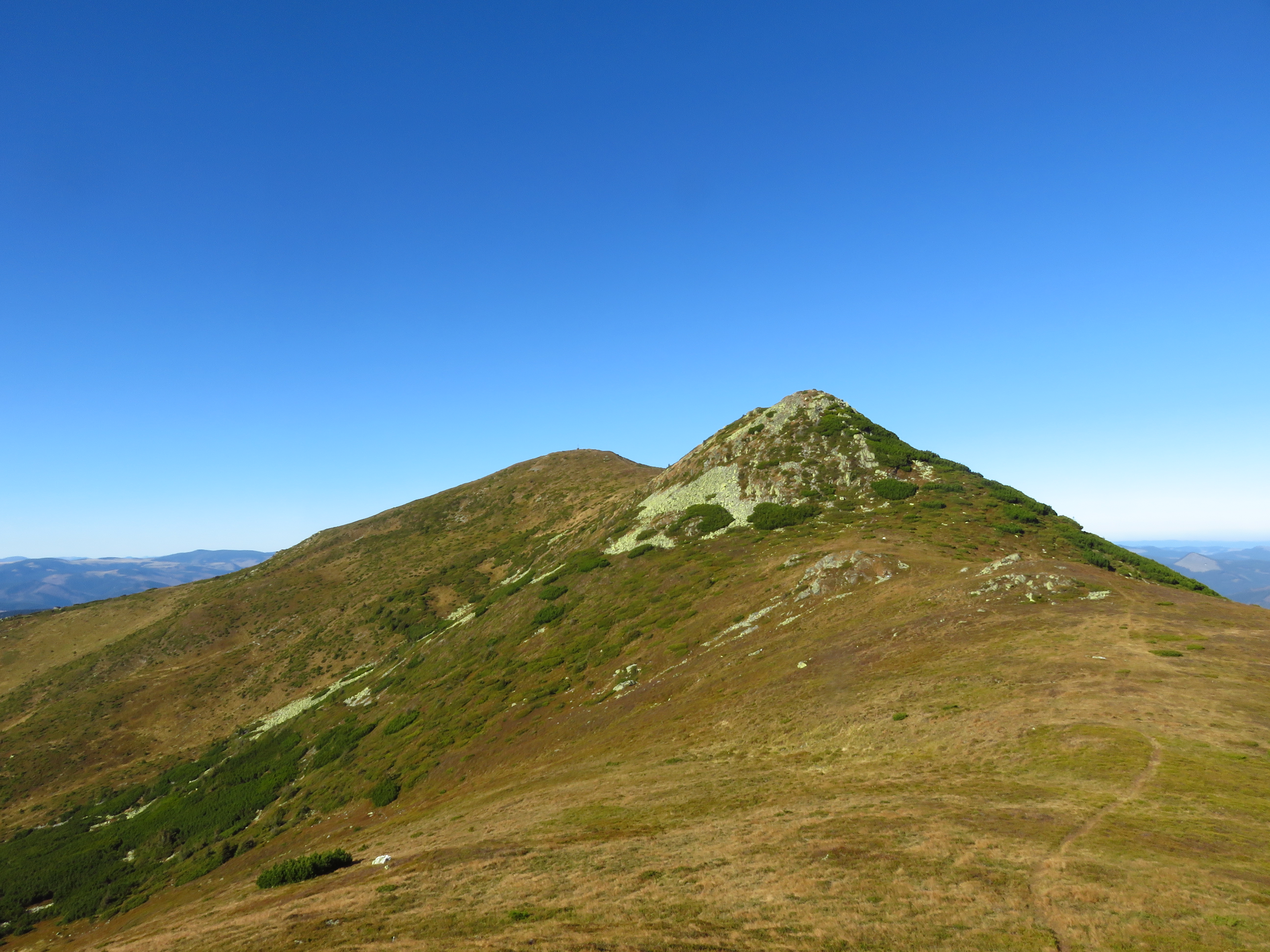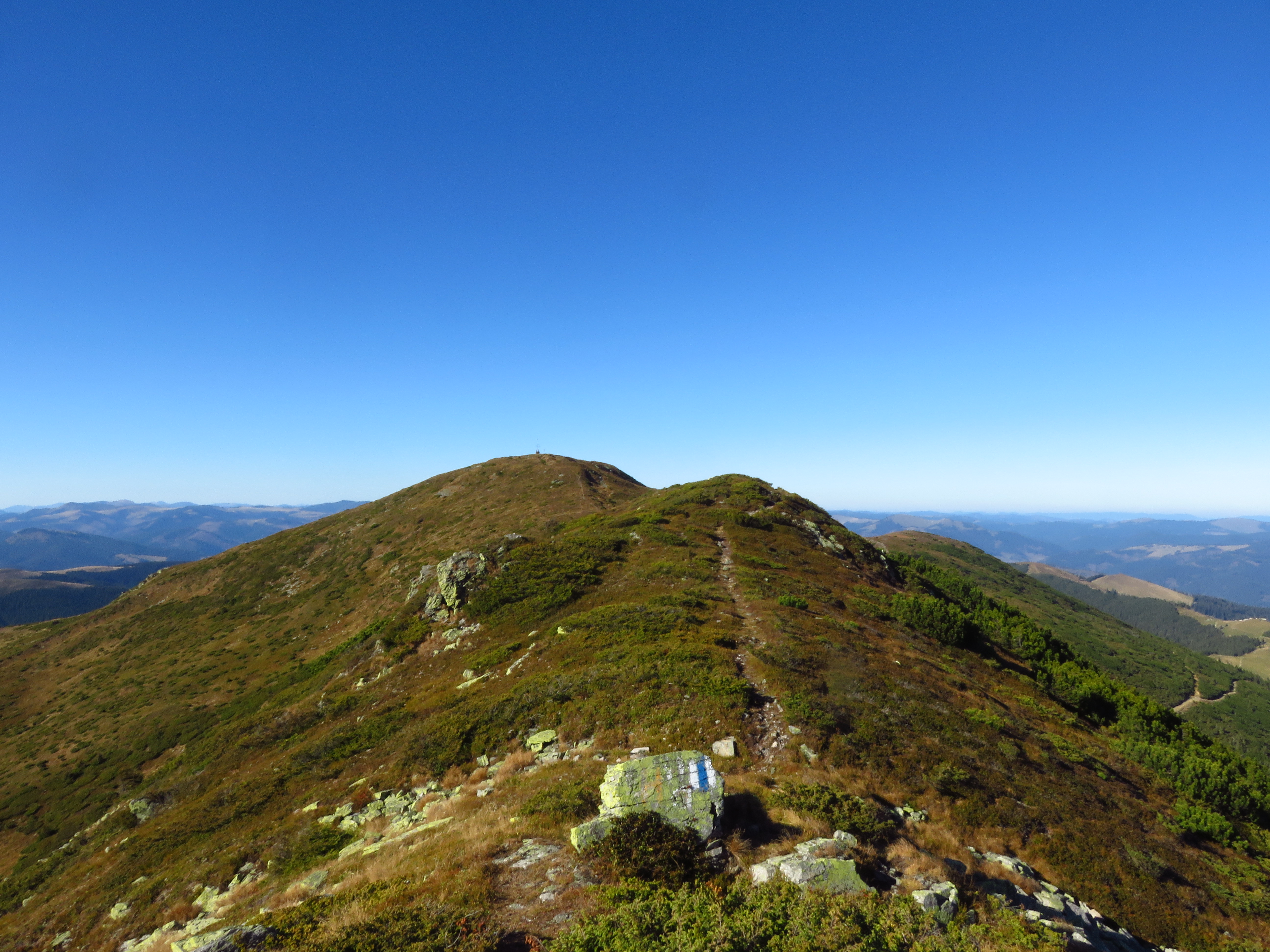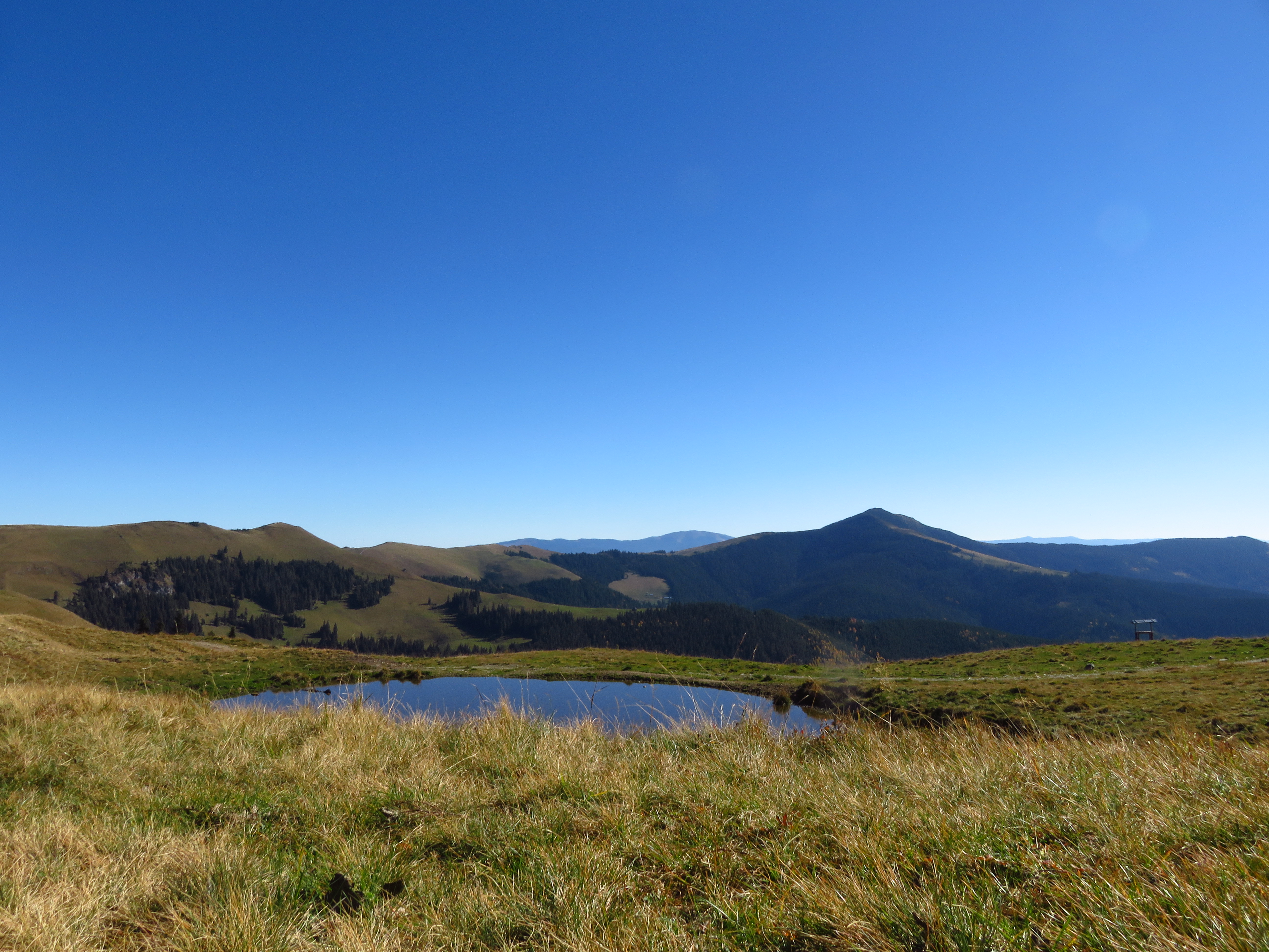 The next morning I continued on the blue stripe trail to Omu Peak (1932m). This was one of only two peaks that were actually on the trail; the other one was Pietrele Rosii Peak (1772m). Actually no – Omu Peak was preceded by a much peakier, but unnamed peak that had me swearing because I didn’t expect to have to clamber (and I didn’t feel like it). At Omu Peak navigation got a little more difficult; there was an ancient rusty signpost that didn’t give out all too many clues. I descended west on what I thought must be the red circle trail – but there were no red circles to be seen. Nevertheless, I seemed to be heading in the right direction. I soon saw a car and two men picking herbs. One of them turned out to be the owner of Cabana Croitor, one of the cabanas at the pass I was heading towards. I didn’t even know it existed, but happily accepted his invitation to come and stay. I continued walking and saw a lady gathering cranberries; she said they would leave soon and I could hop on if I wanted to. A few kilometres down the trail they did indeed overtake me and I joined them. It was 5pm and I had about 8km ahead of me, so I was quite happy to move a bit faster.