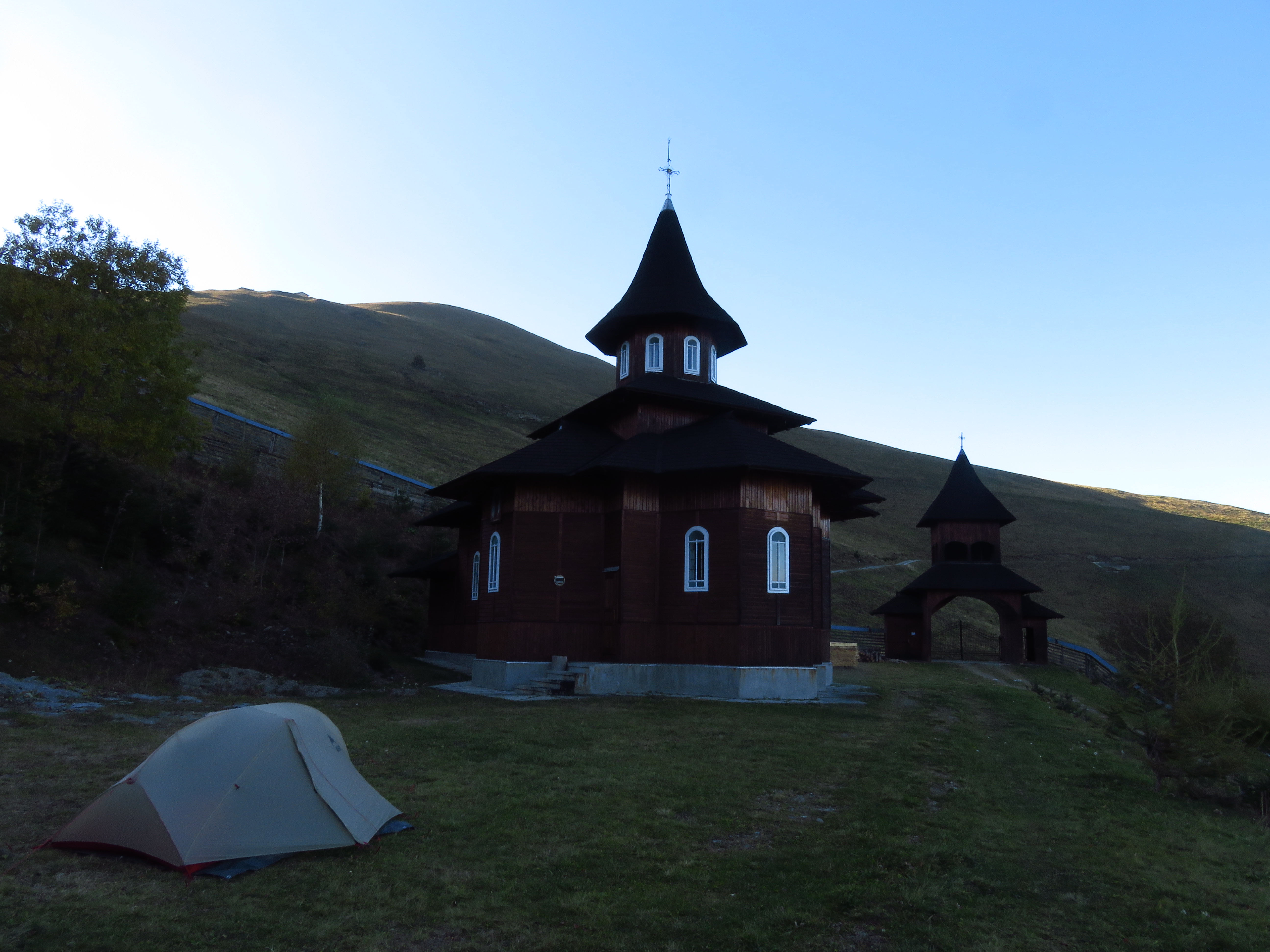 After about 20km I could see my destination, a little monastery called Schitul Sfânta Cruce, glimmering in the valley. As I covered the last kilometre, I heard the bells ring. I figured staying within the bounds of the monastery would be safer, considering the wolves – but as I walked through the gate I was approached by two giant sheep dogs and several smaller, but more vicious ones. A glum-looking woman appeared and asked me what I wanted. I explained I was looking for a place to pitch my tent, and half-hoped they’d have a bed for me. Despite the fact there were four buildings on the premises they offered no cazare – but she pointed to a corner where I could pitch my tent. By this time I doubted whether I wanted to stay – the dogs seemed a bit of a challenge. But I decided to give it a go and conquer my fears. I asked her about five times whether they really wouldn’t bite. She said I need not be worried. In an attempt to befriend her, I asked how many monks lived there. ‘Just one,’ came the curt reply – ‘and I am his mother.’ Right. The matron. A force to be reckoned with.